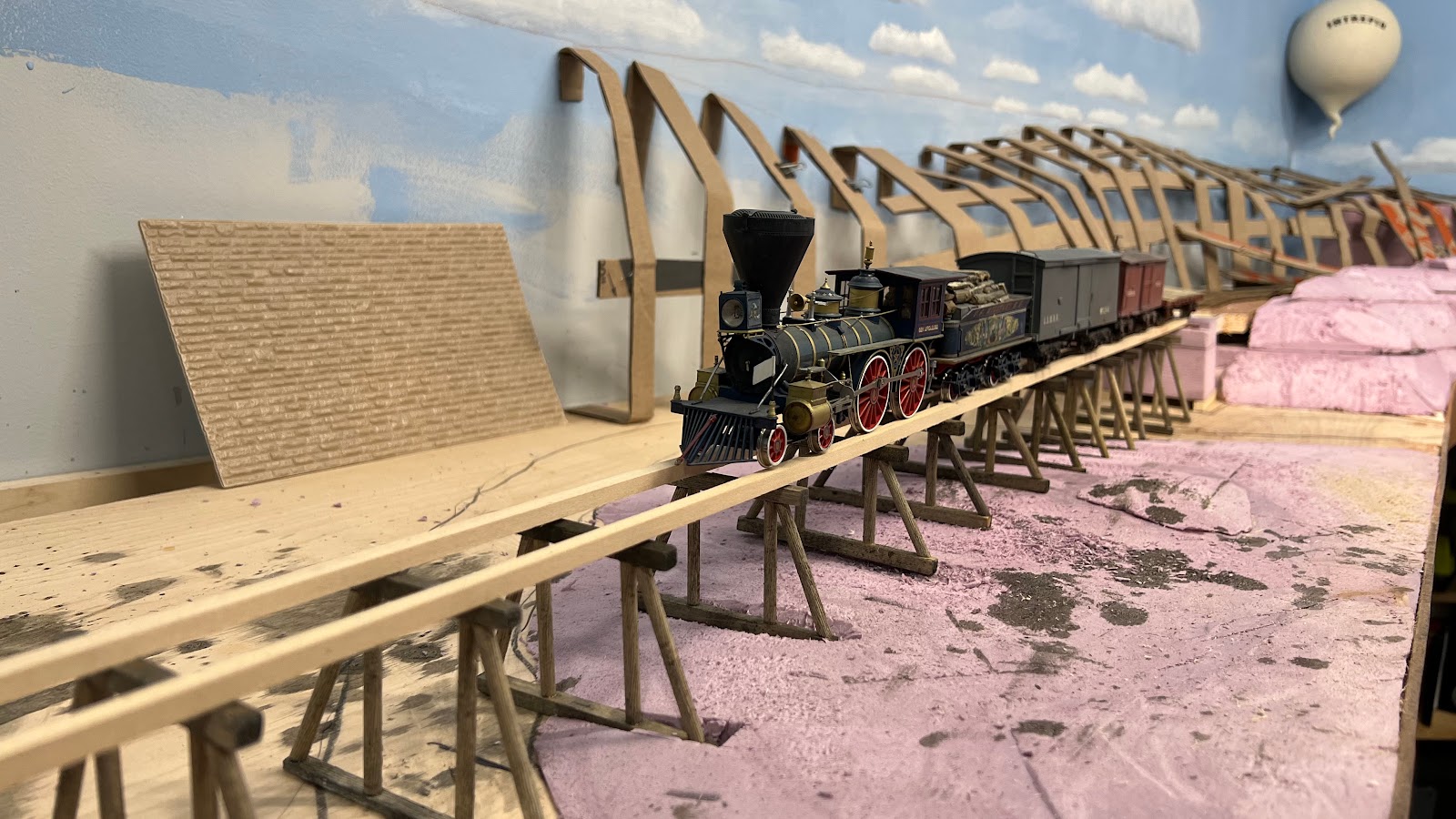 I tacked the balloon on the wall to get a look at how it will appear. It is kind of a scene stealer. The final vignette will show the ground crew getting the balloon ready for a flight.